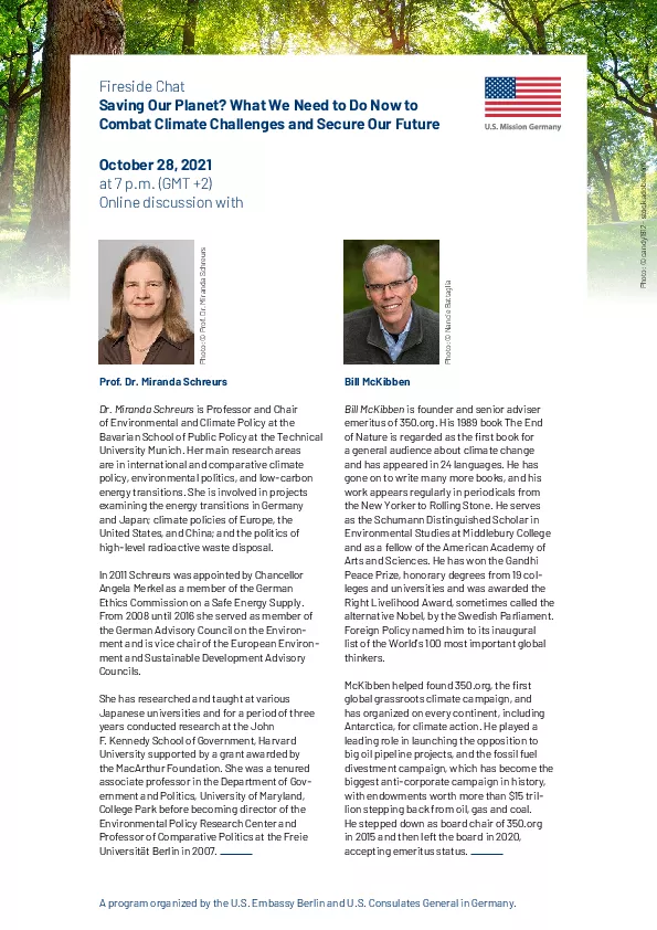 Prof. Dr. Miranda Schreurs of the Department of Environmental and Climate Policy speaks about the challenges of the climate crisis, among other topics, in the lecture series hosted by the U.S. Embassy in Berlin and the U.S. Consulates in Germany with environmentalist, activist and best-selling author Bill McKibben.