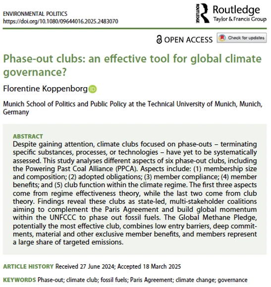 Dr. Florentine Koppenborg published a paper in Environmental Politics on ‘Phase-out clubs: an effective tool for global climate governance?’