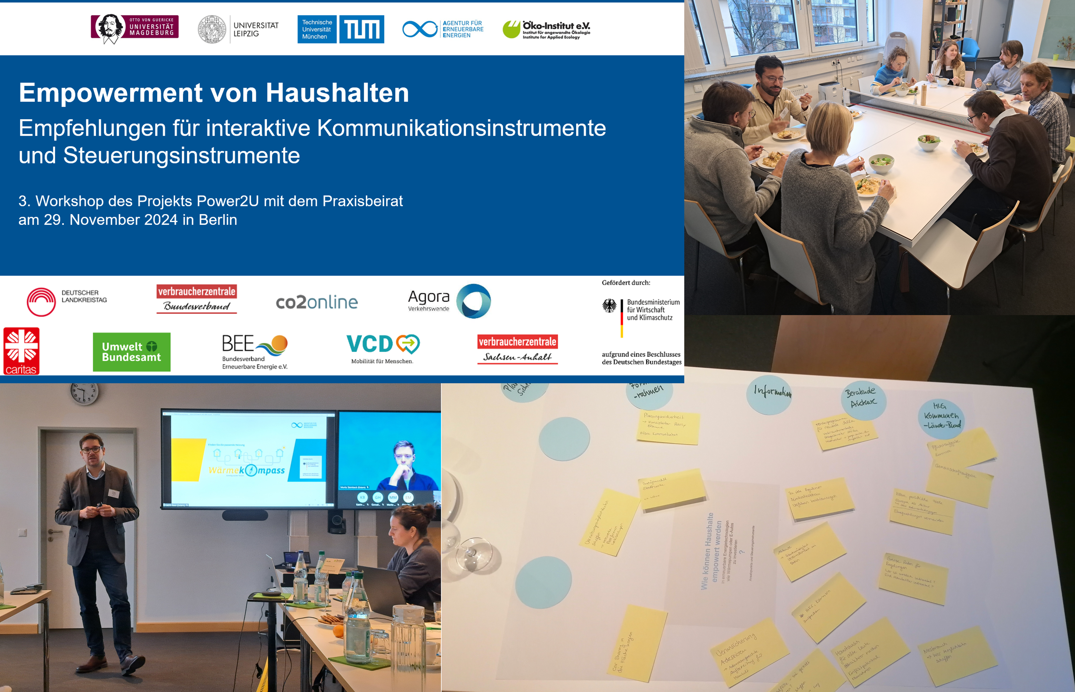 At the end of November 2024, a workshop with the practical advisory board of the ‘Power2U’ project was held at the Öko-Institut e.V. in Berlin. The project teams from the Hochschule für Politik (HfP / TUM), the University of Magdeburg (OVGU), the University of Leipzig (UL), the Agency for Renewable Energies (AEE) and the Öko-Institut e.V. met with the project's advisory board and external guests. The aim was to discuss the research results of the scientific teams and to develop recommendations for action based on the input of the practical advisors and guests. After exciting discussions about the economic, psychological and political science contributions, the different perspectives were productively brought together in the World Café format. At the end of the project, the results of the inter- and transdisciplinary work and recommendations for empowering households to invest in heat pumps and electric vehicles will be published.