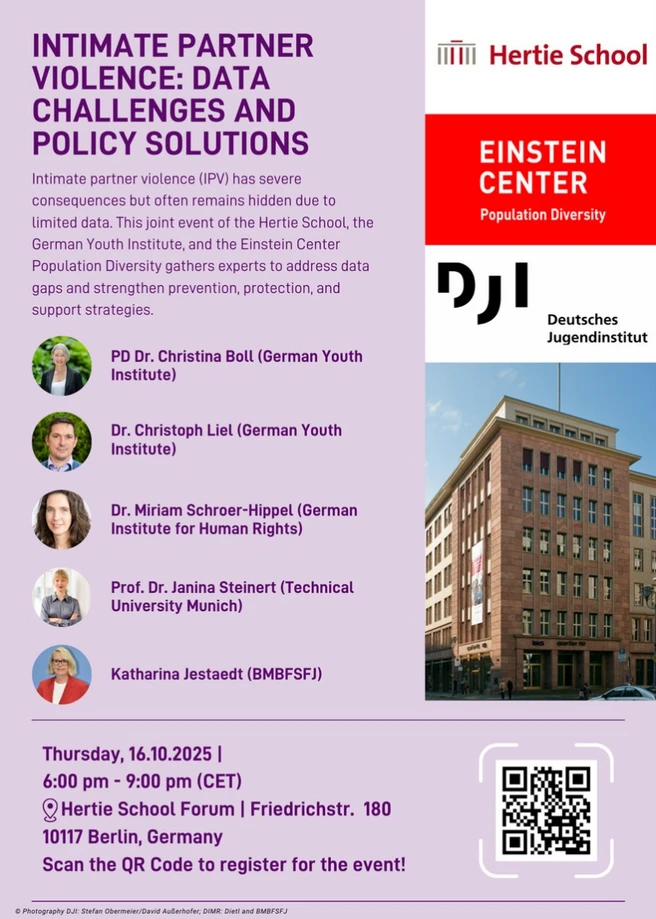 This joint event of the Hertie School, the German Youth Institute, and the Einstein Center for Population Diversity brought together experts from academia, government, and public institutions to explore how IPV can be measured and how data gaps can be addressed across different contexts, aiming to identify pathways toward more robust prevention, protection, and support strategies that reflect the full spectrum of IPV.