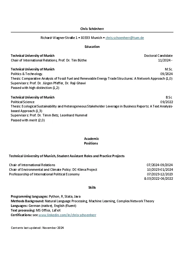 Chris is a Doctoral Candidate at the Chair for International Relations (Prof. Tim Büthe) at the Technical University of Munich. He holds a B.Sc. in Political Science and an M.Sc. in Politics & Technology from the Technical University of Munich.