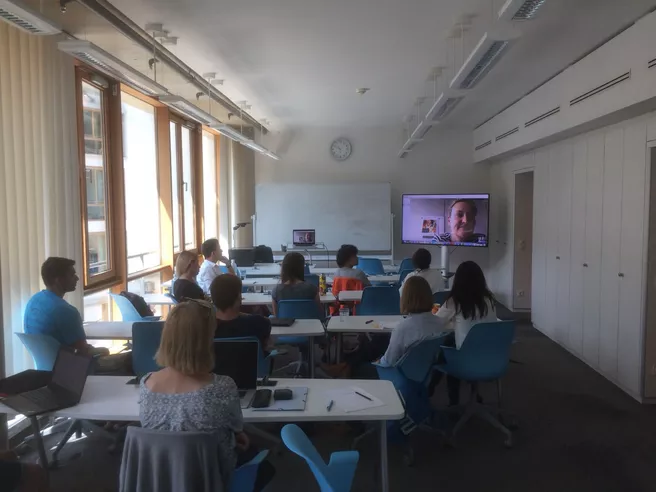 Am 8. Juni 2018 war Frau Michaela Holl von der Europäischen Kommission, DG Energie, Referat für erneuerbare Energien, mit Hilfe der Online-Technologie zu Gast in einem unserer Master-Seminare unter der Leitung von Dr. Stefan Ćetković: "Mehrebenen-Governance: EU Energie-, Klima- und Umweltpolitik und Technologie". In angenehmer und inspirierender Atmosphäre hatten die Studenten die einzigartige Gelegenheit, mit Frau Holl über die aktuellen Verhandlungen auf EU-Ebene zu dem zukünftigen EU-Paket für saubere Energie zu diskutieren.