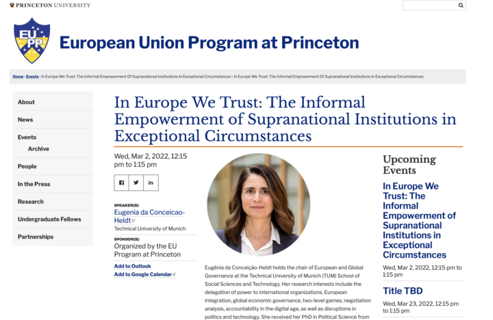 Frau Prof. da Conceicao-Heldt wird im Sommersemster 2022 als Visiting Research Scholar an der Princeton University's School of Public and International Affairs sein. Im Rahmen dieses Aufenthaltes wird sie einen Vortrag zum Thema "In Europe We Trust: The Informal Empowerment of Supranational Institutions in Exceptional Circumstances" beim European Union Program am 02. März 2022. halten. Weitere Informationen sind hier zu finden.