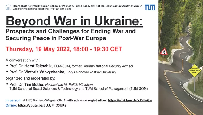 Zum Abschluss der Diskussion, die vom HfP-TUM Lehrstuhl für Internationale Beziehungen organisiert wird, werden die Gäste Fragen aus dem Publikum beantworten. Präsenzteilnehmer können ihre Fragen vor Ort persönlich stellen; online-Teilnehmer werden gebeten, ihre Fragen während der Veranstaltung per Email an UkraineEvent@hfp.tum.de zu richten. Die Veranstaltung wird in englischer Sprache stattfinden.
