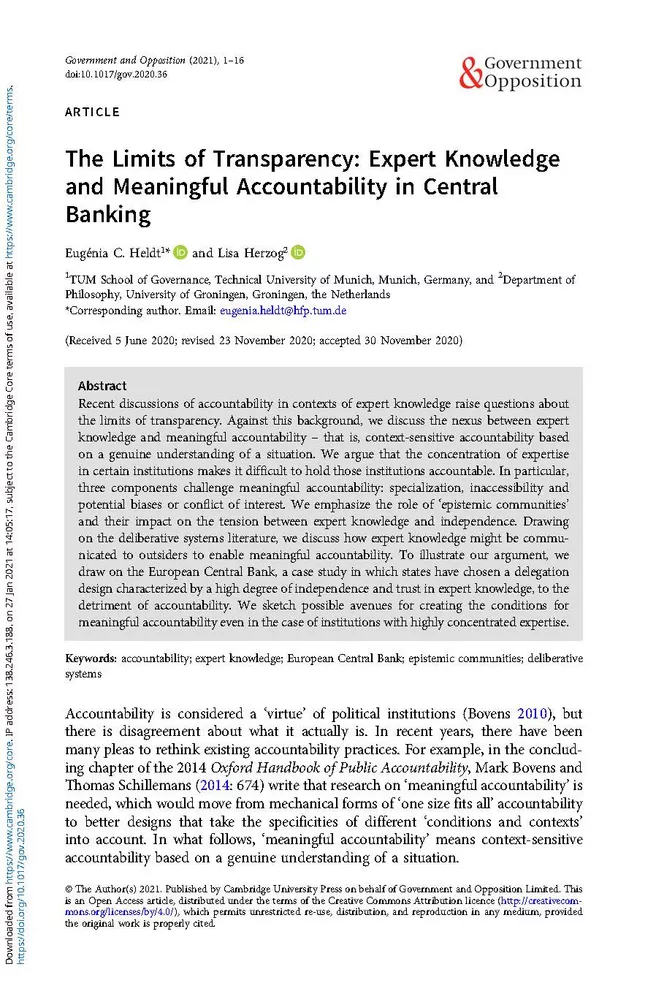 Prof. Eugénia da Conceição-Heldt und Prof. Lisa Herzog haben gemeinsam einen Artikel zur Thematik The Limits of Transparency: Expert Knowledge and Meaningful Accountability in Central Banking publiziert. Der Beitrag wurde von der Zeitschrift Government and Opposition veröffentlicht und kann hier nachgelesen werden.