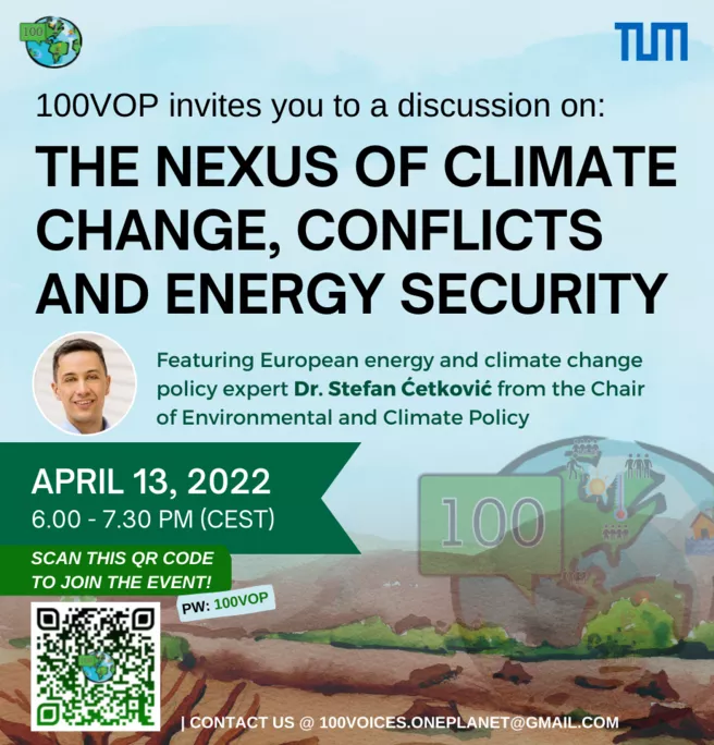 Im Rahmen einer Veranstaltung der TUM Universitätsgruppe “100 Voices – One Planet” (100VOP) spricht Dr. Stefan Ćetković, Postdoktorand am Lehrstuhl für Umwelt- und Klimapolitik, als Experte und gibt Einblicke in die Auswirkungen von Klimawandel und Konflikten auf die Energiesicherheit und Energiewende in Europa.