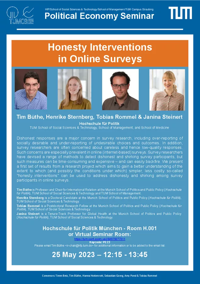 Abstract: Dishonest responses are a major concern in survey research, including over-reporting of socially desirable and under-reporting of undesirable choices and outcomes. In addition, survey researchers are often concerned about careless and hence low-quality responses. Such concerns are especially prevalent in online (internet-based) surveys. Survey researchers have devised a range of methods to detect dishonest and shirking survey participants, but such measures can be time-consuming and expensive – and can easily backfire. We present a first set of results from a research project which aims to gain a better understanding of the extent to which (and possibly the conditions under which) simpler, less costly so-called "honesty interventions" can be used to address dishonesty and shirking among survey participants in online surveys.