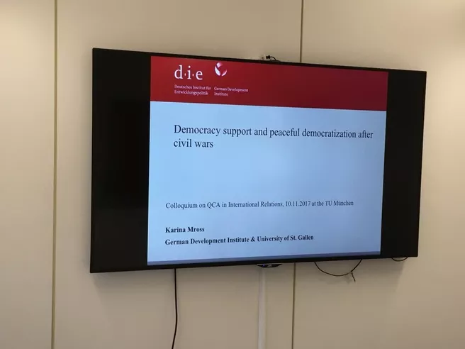 Im Rahmen des Kolloquiums wurden zwei Forschungsprojekte von externen ReferentInnen vorgestellt. Zunächst präsentierte Aaron Martin (LMU/University of Chicago) seine aktuelle Forschung zum Thema „Party Group and Party System Institutionalization in the EP“. Danach stellte Karina Mross (Deutsches Institut für Entwicklungspolitik, Bonn) ihre Studie mit dem Titel „Democracy support and peaceful democratization after civil wars“ vor. Beim Kolloquium durften wir dieses Mal KollegInnen der Universitäten München, Bamberg und Regensburg begrüßen.