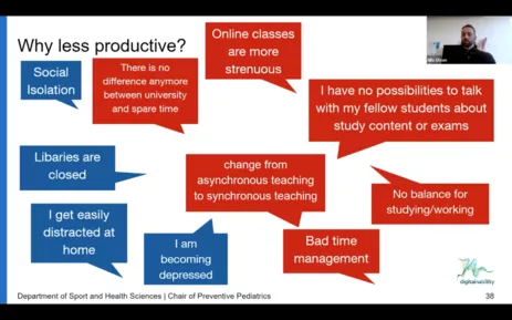 Vor der Pandemie, während des ersten und des zweiten Lockdowns sammelte TUM4Health Daten zur study-(work)-life-balance der TUM-Studierenden und kommt zu teils alarmierenden Erkenntnissen: Während die Studierenden während des ersten Lockdowns die Vorzüge größerer Flexibilität und Freizeit genossen (vor allem durch asynchrone Veranstaltungen) und sich angeregt fühlten, gesünderes Verhalten zu entwickeln, nahm ein von Gefühl Einsamkeit und der Mangel an sozialen Interaktionen, Schwierigkeiten beim Zeitmanagement und die Wahrnehmung von Stress im zweiten Lockdown zu.