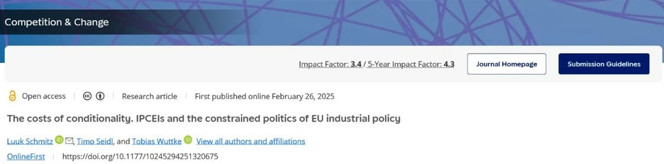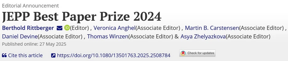 Timo Seidl and Luuk Schmitz (Max Planck Institute for the Study of Societies) won the JEPP Best Paper Prize 2024 for their paper ‘Moving on to not fall behind? Technological sovereignty and the ‘geo-dirigiste’ turn in EU industrial policy’.
